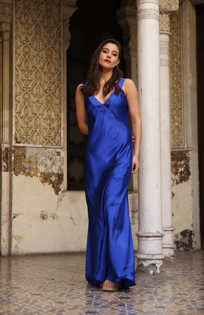 PRE ORDER: VESTIDO MAXI LEONOR SEDA AZULINO